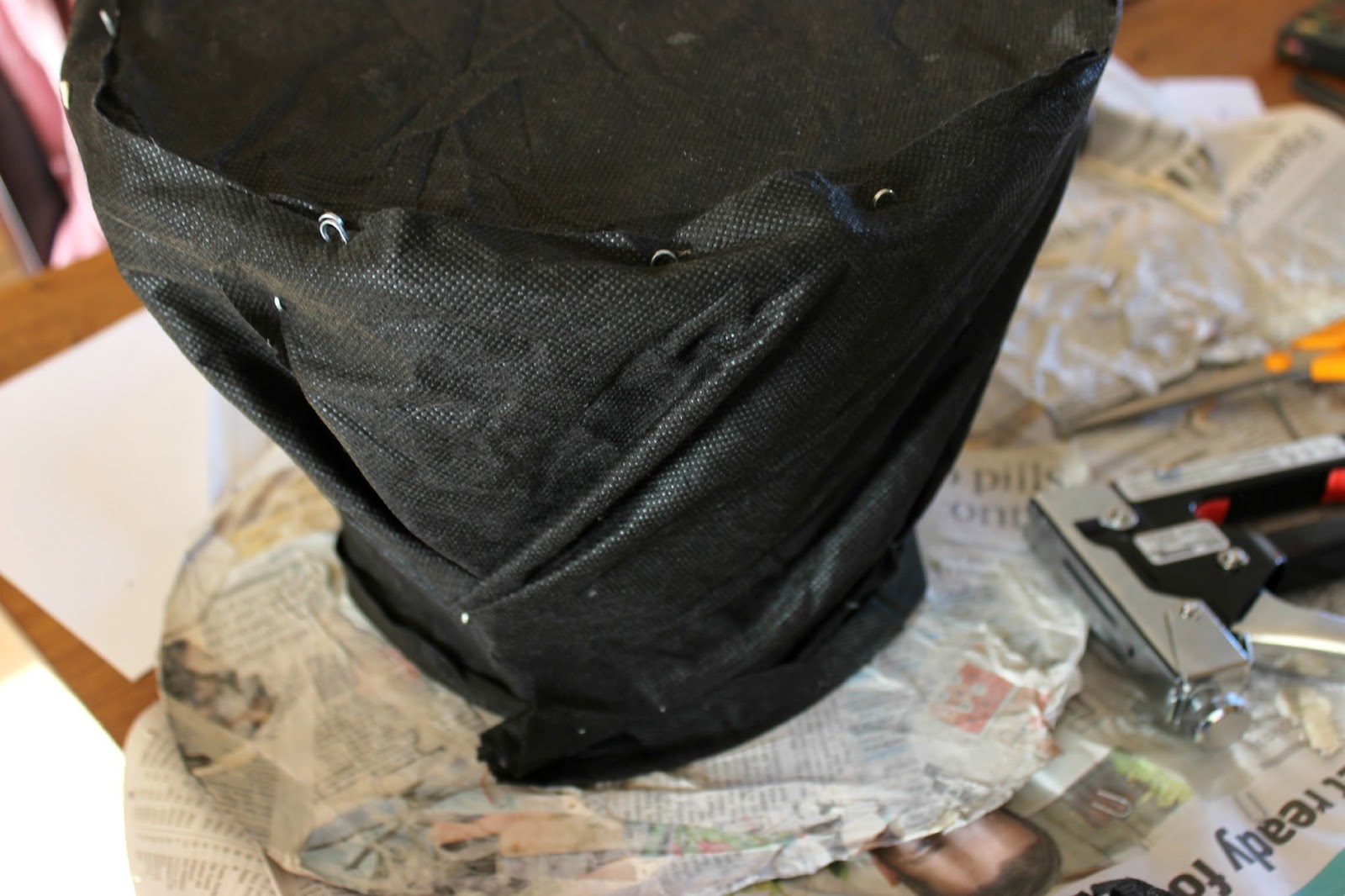 9. Depending on what kind of fabric you are using, cover the hat by sticking it in place with glue or staples. I used a staple gun with mine as PVA glue wasn't strong enough and a glue gun went straight through the fabric. The staples do look a little messy but I tucked in what I could under other sections on the fabric.